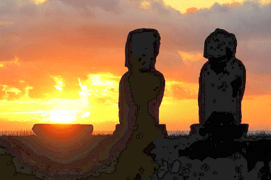 Hanga Roa est le seul village de l'île , unique port. Sur le rivage, quelques moais ont été redressés sur leur tertre, dos à l'océan et au soleil couchant.