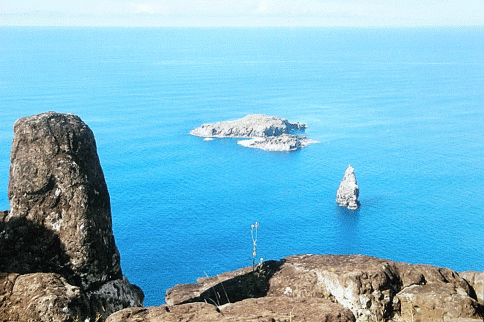 Selon le mythe de l'Homme-Oiseau, une fois par an, en septembre, au printemps austral, une frégate (ou une sterne) venait pondre sur un îlot (Motu Nui, au dernier plan).Celui qui, le premier, rapportait l'oeuf sur l'île était déclaré Homme-Oiseau: il avait pour un an le pouvoir politique et religieux (lui ou le chef de son clan).