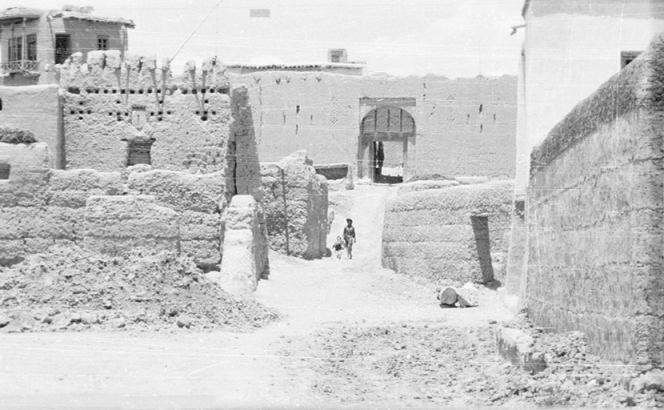 Rue de village, un père et sa fille.